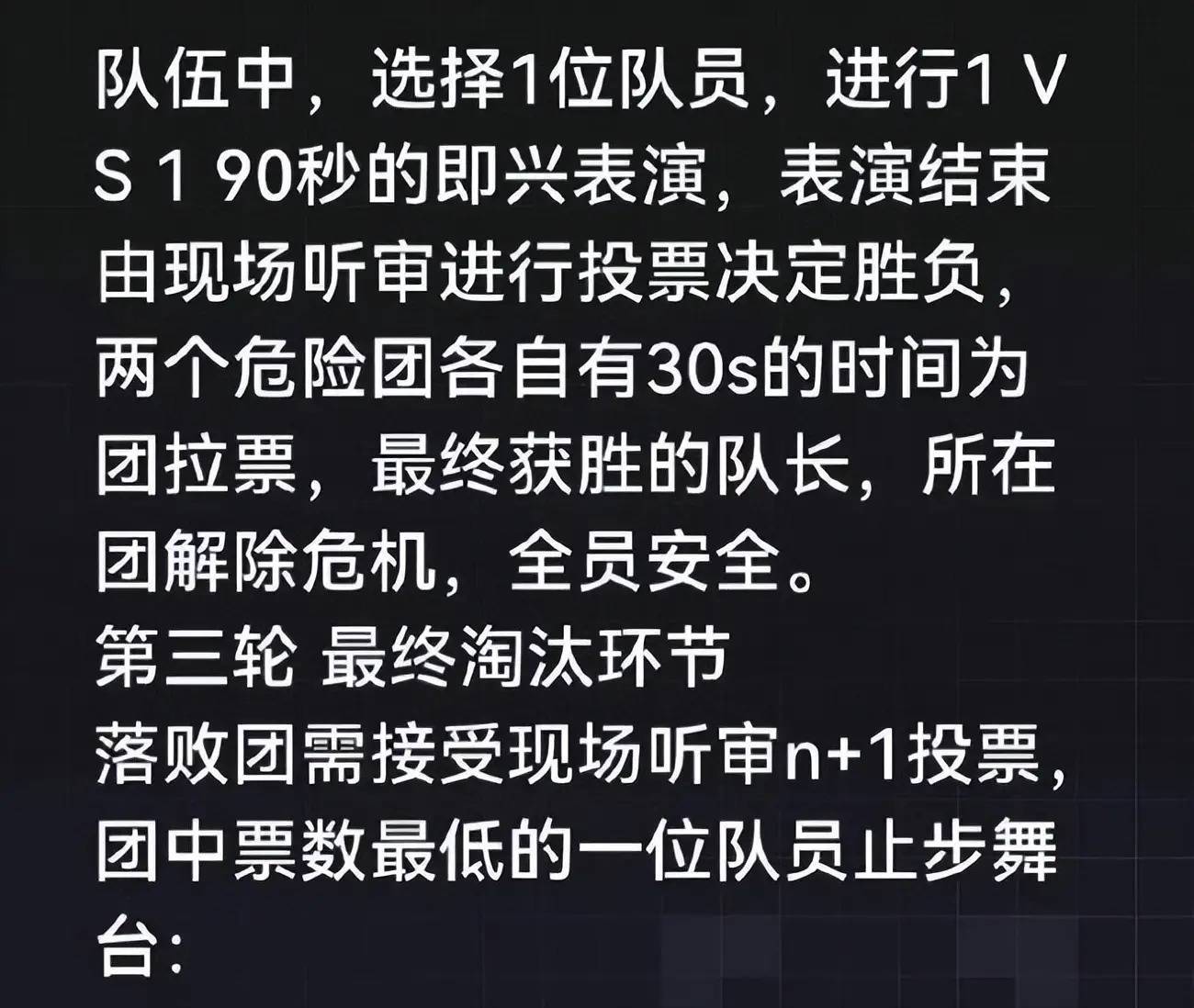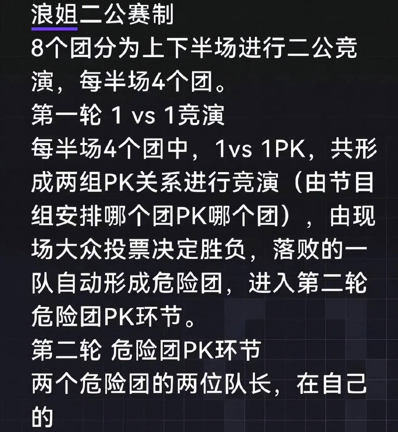从传出的消息上看,第二轮舞台公演依旧分为上下半场进行,每个半场分四个团,第一轮采用1对1的赛制,落败的团会自动成为危险团,她们要进入第二轮对决。