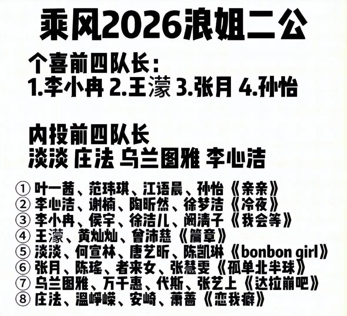 在第二轮舞台公演中,共有8位姐姐成为队长,个人喜爱值排名前四的姐姐直接成为队长,内投排名前四的姐姐也直接成为队长,这样的情况出现后,李小冉、王濛、张月、孙怡、淡淡、庄法、乌兰图雅、李心洁成为队长。